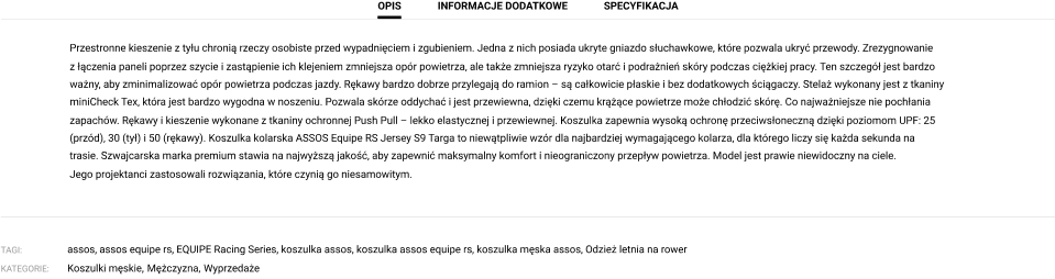 ASSOS of Switzerland, założone w 1976 roku, jest firmą specjalizującą się w tworzeniu nowoczesnej odzieży rowerowej, z naciskiem na innowacyjność i elegancki design.